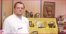 世界各国から出品されたチョコレート細工の作品が壁一面に並んでいます。
